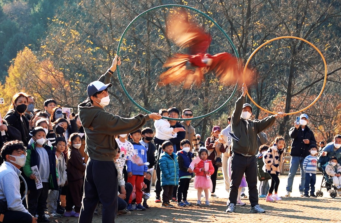 푸른 하늘에 무지개를 그리듯 화려한 색깔을 가진 앵무새들의 비행과 개인기를 만나볼 있다.