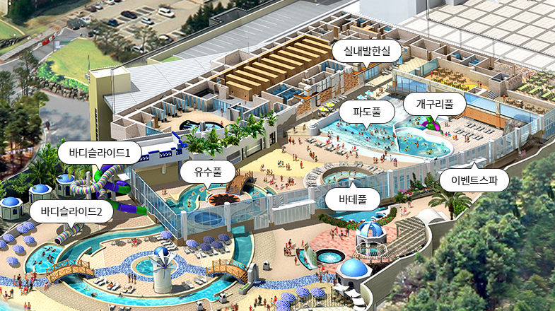 다양한 휴게실과 놀이시설이 배치되어 있는 블루캐니언에서 국내 최초 140m 업힐 슬라이드와 국내 최장 201m, 최대 5m 폭의 익스트림 리버가 만들어 내는 짜릿한 재미를 즐겨보세요.
