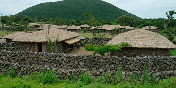 제주초가는 주위 지형보다 낮은 곳에 돌담을 두르고 건물을 별동으로 배치했다.