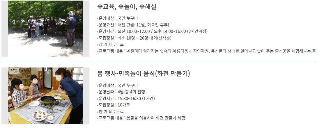 숲과 자연환경에 대한 지식과 숲탐방 안내 및 자연물을 소재로 한 목공예 체험을 할 수 있는 프로그램