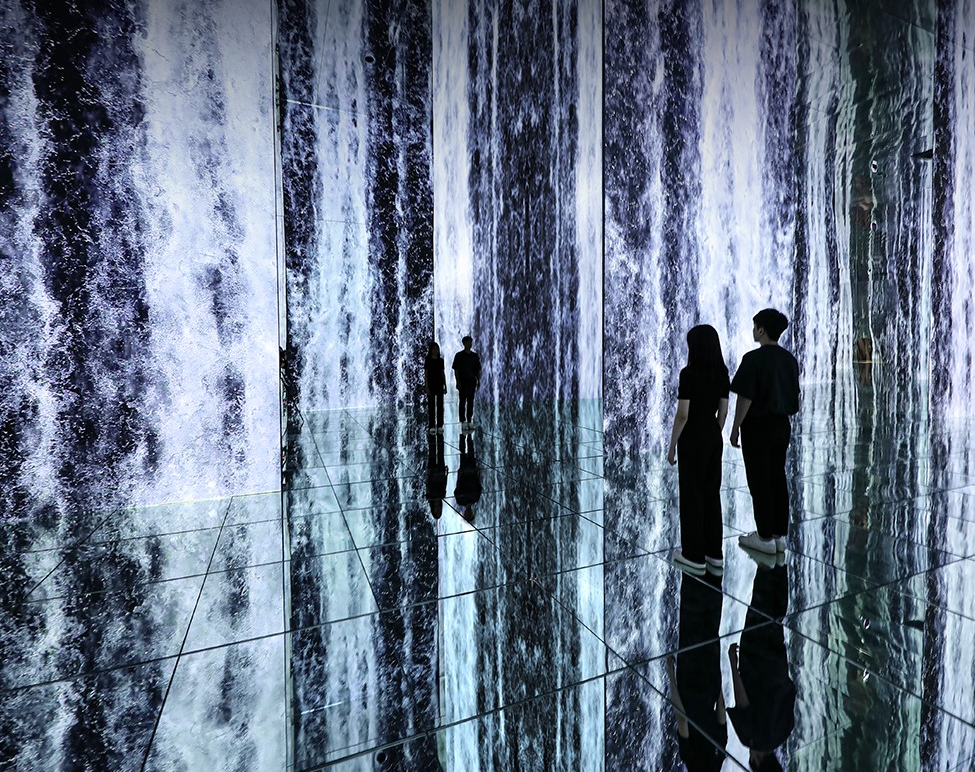 8m 높이에서 쏟아지는 웅장한 미디어 폭포는 나를 감싼 6면의 모든 공간을 통해 무한 확장되며 중력을 벗어난 초현실 공간에 서있는 장면을 연출한다.