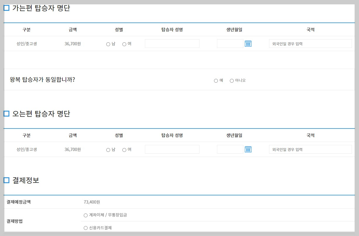 ☑️가는 편 / 오는 편 승선 인원 선택