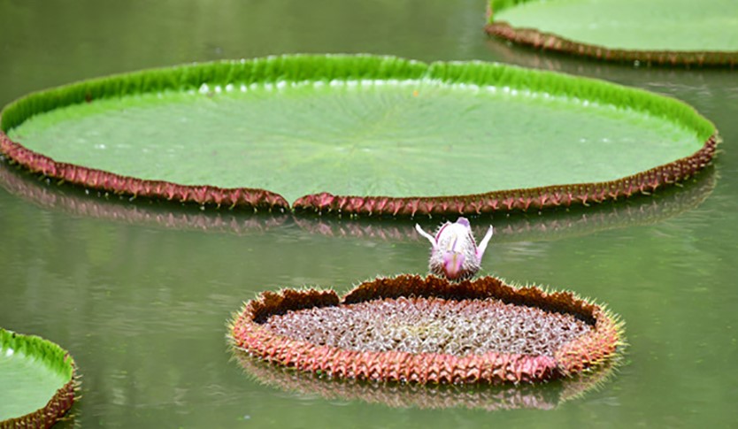 빅토리아 연꽃은 해가 지기 시작하면 꽃봉오리가 네 쪽으로 갈라져 흰 꽃을 피우기 시작하는데 다음날 저녁이면 그 꽃 잎이 양파처럼 하나씩 벗겨지면서 핑크빛으로 꽃 색깔이 바뀐다.