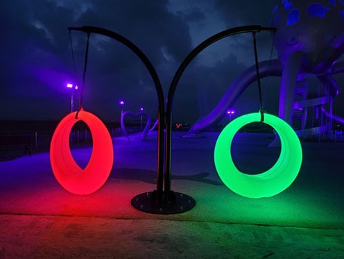 이색적인 네온 조명 빛이 가득한 그네에 앉아 보세요.